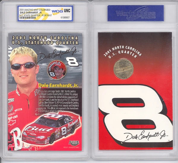 This is a special priced wholesale buy it now listing for a DALE EARNHARDT, JR. NORTH CAROLINA U.S. STATE QUARTER. This product is highly collectible and extremely unique. To start it features a Genuine U.S. North Carolina Statehood Quarter Colorized with an official image of Dale Earnhardt, Jr.
