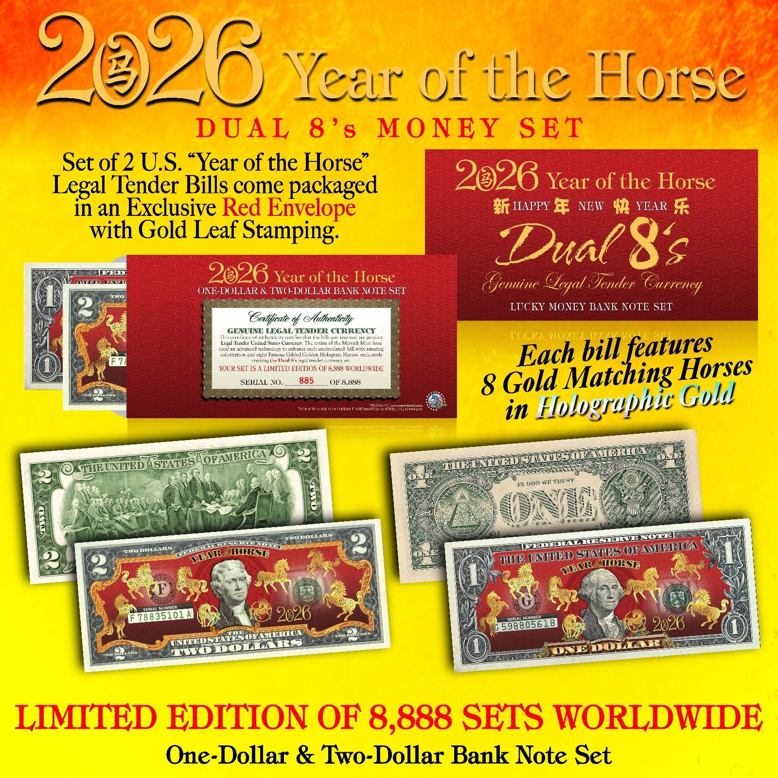 To further enrich this product, the Set of 2 U.S. “Year of the Horse” Gold Matching Dual 8’s Legal Tender Bills come packaged together in an exclusive Red NUMBERED Envelope with beautiful Gold Leaf stamping which is a symbol of energy, happiness, and good luck. This New Year, give a gift of good fortune to family and friends with the Dual 8’s Lucky Money Note Set, which is enclosed in an attractive Red NUMBERED folder festively adorned with Chinese symbolism, capturing the significance of the New Year.