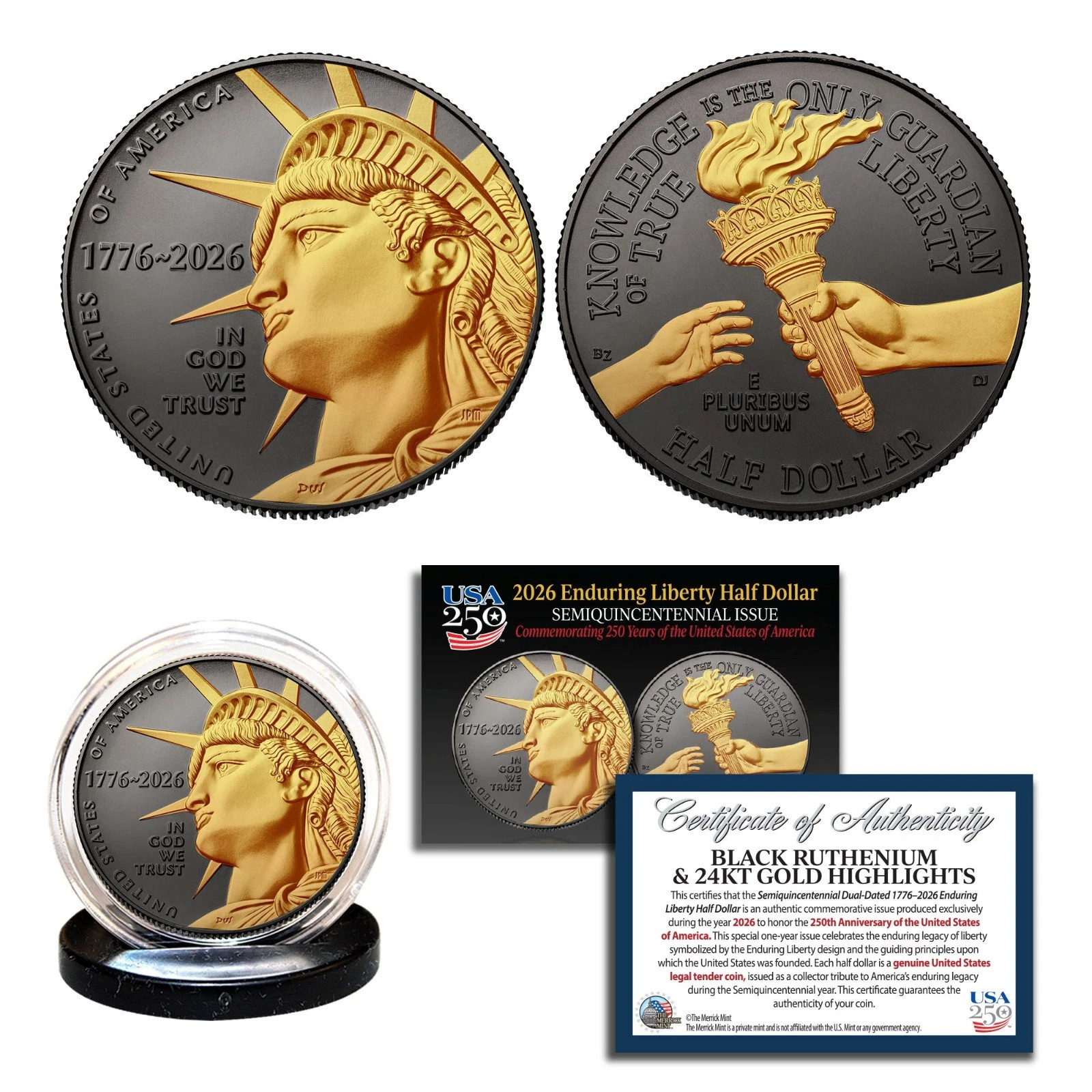 Celebrate 250 Years of American Independence with this stunning 2026 Enduring Liberty Half Dollar (Philadelphia Mint), Precision-finished in Black Ruthenium with 24K Gold Highlights for a bold, premium finish.