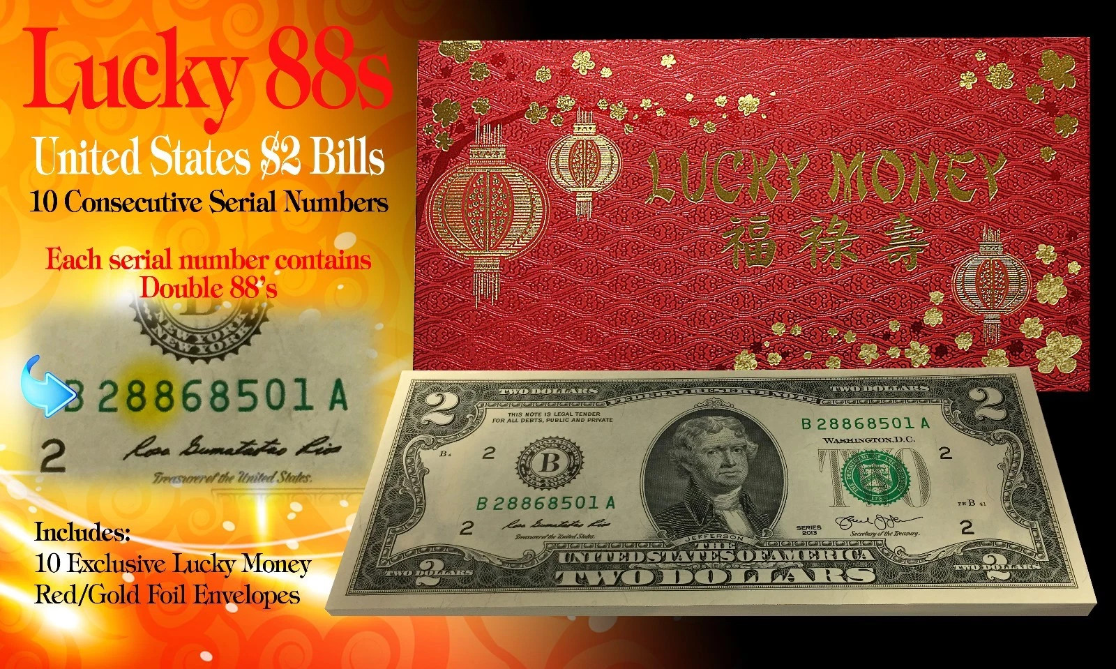 Featuring 10 Fresh Uncirculated $2 Bills! Straight from the Federal Reserve, these Authentic $2 Bills have never been touched and are in Mint Condition. All 10 bills in these packs are in Consecutive (Sequential) Numbered Order. What makes these $2 Bills so Unique and Special is that all 10 Bills contain DOUBLE 8’s (88) in the Serial Numbers. You may find a few with “88” in the Serial Number, but to find untouched crisp packs of 10 with all 88’s in the Serial Numbers is nearly impossible. Number 88 symbolizes fortune and good luck in Chinese culture.