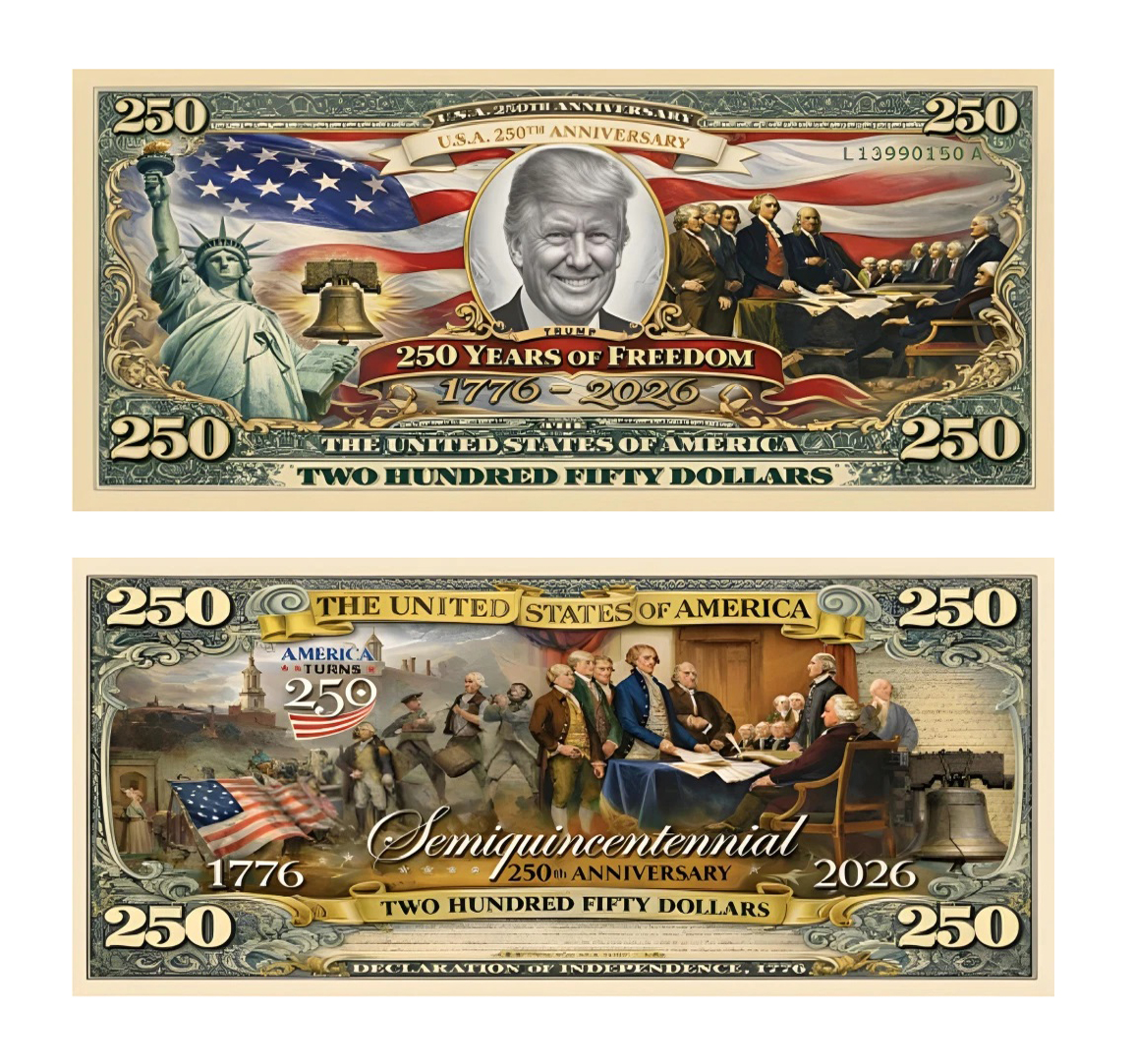 Includes 20 fun Novelty Bills commemorating President Trump and the USA's Semiquincentennial 250th Birthday!