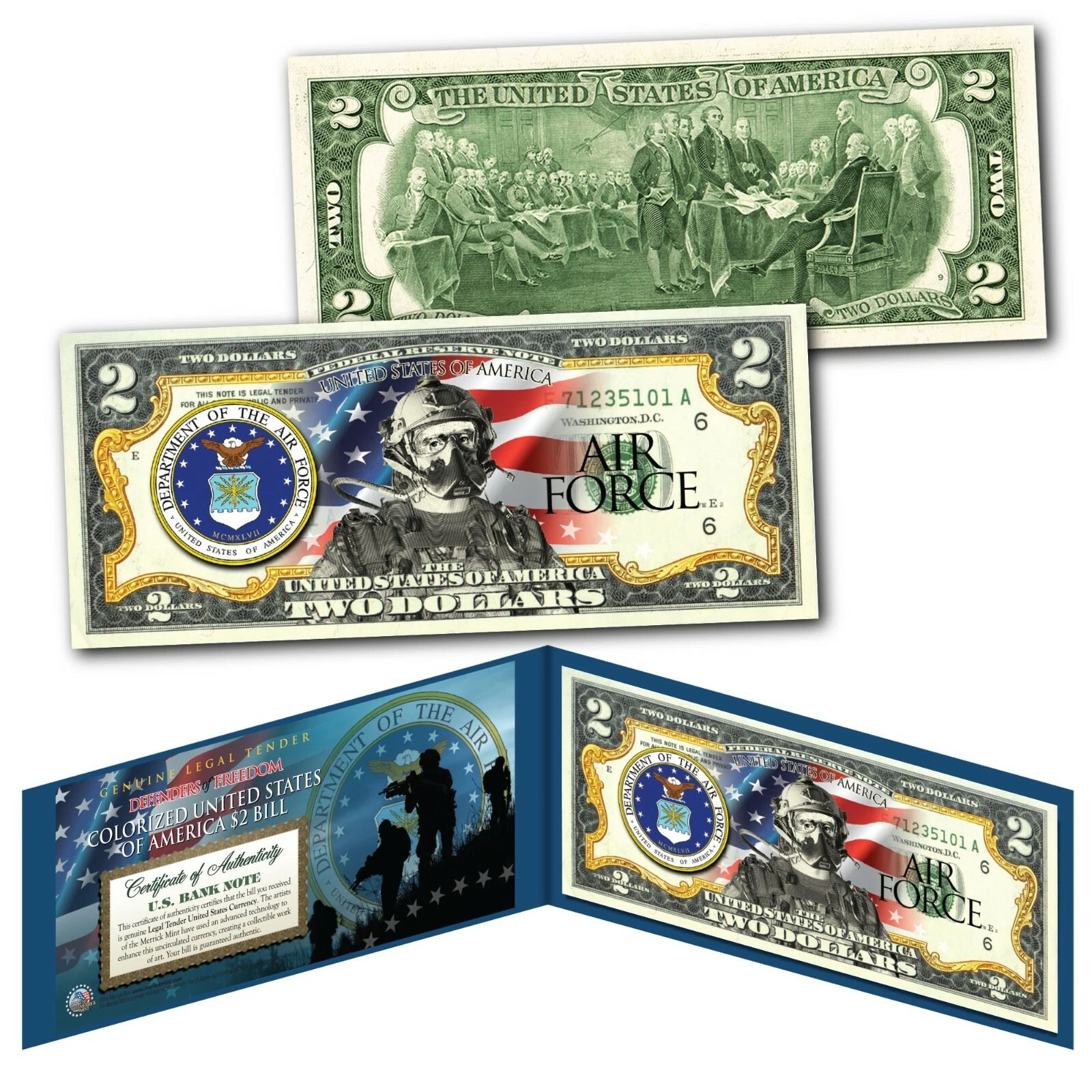 $2 bills are rarely-circulated collector favorites, which is why The Merrick Mint is so pleased to present the Official U.S. $2 Special Forces Military Bill Collection. . Each Two-Dollar Banknote features a portrait of President Thomas Jefferson and showcases each branch of the U.S. Military Special Forces. The reverse of each U.S. $2 bill features its historic portrait of the signing of the Declaration of Independence. To protect your national treasures for future generations, each crisp, Uncirculated issue is preserved within a crystal-clear holder.