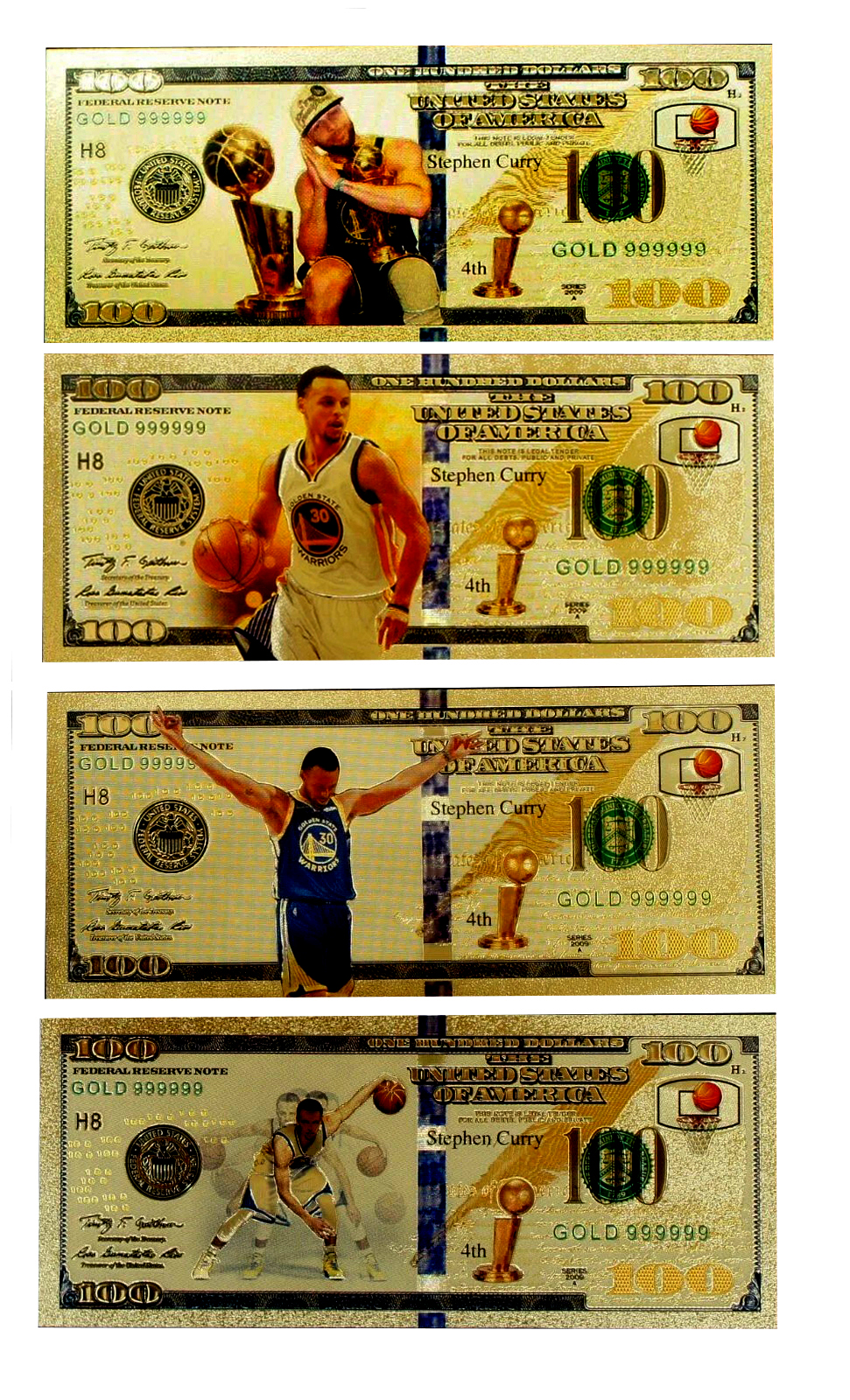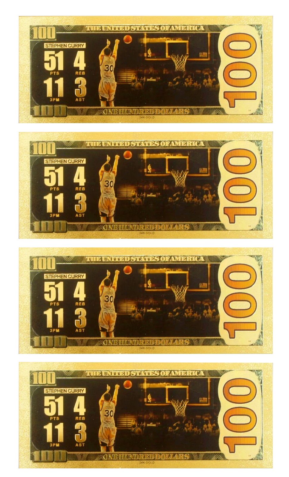 Set of 4 Metallic Gold Colorized Stephen Curry $100 Bills.