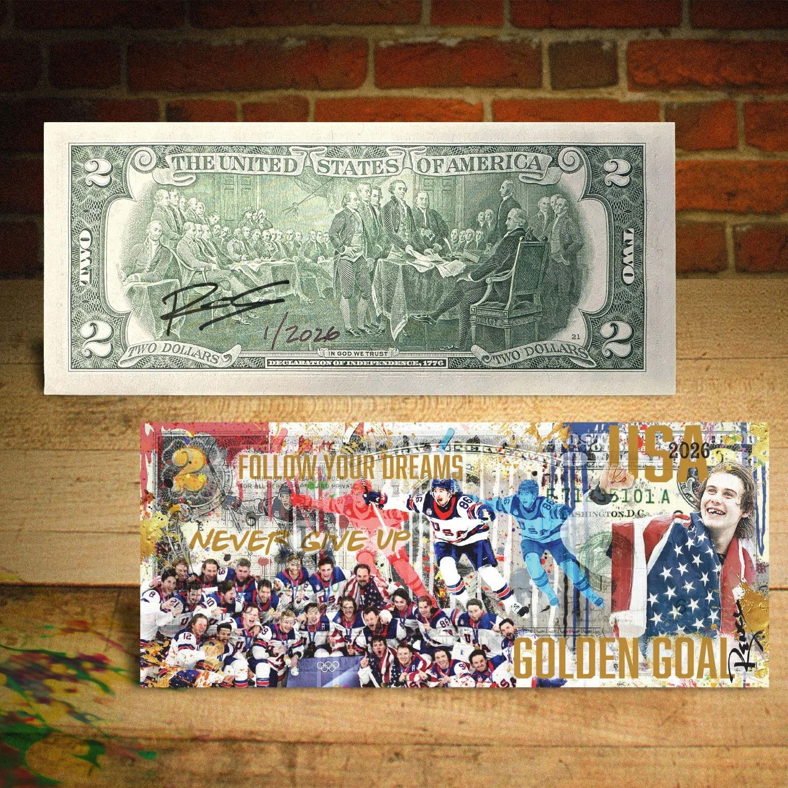 Offered here is a Limited Edition 2026 USA Hockey Gold Medal Rency Art $2 Bill, created on a genuine U.S. $2 bill and enhanced with vibrant fine art giclée printing.
